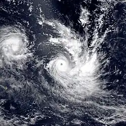 On January 31, a tropical disturbance formed just east of Agaléga. Moving southeastward, it intensified into Moderate Tropical Storm Cezera on February 1,[17] the same day that the JTWC began tracking it as Tropical Cyclone 14S.[2] Cezera quickly intensified, and the JTWC upgraded it to the equivalence of a minimal hurricane on February 3 with 1‑minute peak winds of 150 km/h (93 mph). By contrast, the MFR only estimated peak 10‑minute winds of 95 km/h (59 mph).[17] By February 4, Cezera began a Fujiwhara interaction with Tropical Cyclone Dety, which was located to the east; this caused the former storm to turn back to the northwest while gradually weakening.[17][18] On February 6, the storm turned to the south and later southeast, weakening to tropical depression status that day. Cezera briefly re-intensified into a moderate tropical storm on February 7, but weakened again on the next day while passing just north of St. Brandon. After turning more to the east-northeast, the system turned sharply southward on February 10, and dissipated the next day.[17]