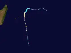 The MFR began tracking a tropical disturbance on March 1 between Mauritius and Diego Garcia,[20] which was followed by the JTWC for several days previously and classified as Tropical Cyclone 18S.[2] Within a day, it intensified into Moderate Tropical Storm Edisoana while tracking southwestward. On March 4, the JTWC upgraded the storm to the equivalent of a minimal hurricane, and on the next day the MFR followed suit by upgrading Edisoana to tropical cyclone status. The latter agency estimated peak 10‑minute winds of 135 km/h (84 mph), while the JTWC assessed a peak 1‑minute intensity of 185 km/h (115 mph). Around that time, the storm passed west of Rodrigues island. Edisoana accelerated southward and gradually weakened,[20] influenced by an approaching trough. On March 7, the storm began transitioning into an extratropical cyclone,[21] completing it by the next day.[20] The extratropical cyclone rapidly intensified due to the influence of the trough and a nearby ridge,[21] later being absorbed by the westerlies.[22]