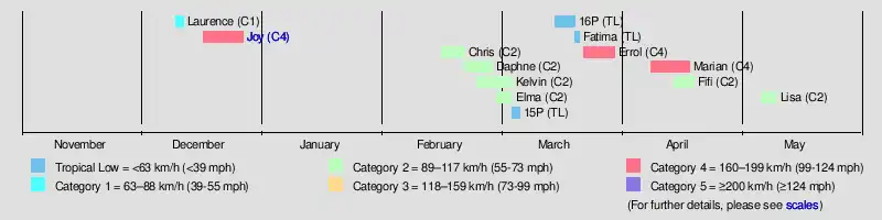 | 12 systems | 10 December – 19 May | 210 km/h (130 mph) | 930 hPa (27.46 inHg) | >$63.9 million | 56 | |||