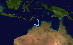On 8 December, a cluster of clouds developed over the Timor sea and moved towards the south-east, following a large scale mid-latitude forcing event.[1] During the next day, the system developed into a tropical low about 360 km (225 mi) to the south-east of Dili, East Timor while continuing to develop and move towards the south-east.[2] During 10 January as the low became detectable on Darwin's radar, TCWC Darwin reported that the low had developed into a category one tropical cyclone and named it Laurence while reporting that the cyclone had reached its 10-minute peak intensity of 65 km/h (40 mph).[1] Early on 11 January, the JTWC designated Laurence as 05S and initiated warnings on the cyclone with 1-minute windspeeds equivalent to a tropical depression.[3] Later that day TCWC Darwin, reported that Laurence had weakened below cyclone intensity under the influence of vertical wind shear from low-level easterlies while the JTWC reported that Laurence had reached its 1-minute peak intensity of 65 km/h (40 mph).[1] The JTWC kept Laurence at its peak intensity until 2000 WST (1200 UTC) the next day when they reported that the cyclone had become equivalent to a tropical depression.[4] Laurence's remnants moved west over the next few days before dissipating near Rowley Shoals early on 16 December.[1] The only damage that was associated with the cyclone, was the sinking of a fishing boat on 11 December, however TCWC Darwin considers this damage to be indirect because the boat was 150 km (95 mi) away, from the cyclone centre and the radius of gales was less than 55 km (35 mi).[1]