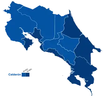 Despite the fact that Rodríguez clearly had no chance against Calderón, his candidacy was considered a smart move, as he would start to be in the spotlight and helping his way in future nominations.[5] As expected, Calderón won the primary election with 75% of the votes. On the other sidewalk former vice president Carlos Manuel Castillo won over young minister Rolando Araya Monge (nephew of ex-president Luis Alberto Monge) in PLN's primaries after a very hostile and traumatic campaign, in which Castillo even accused Araya of links with Narcotraffic, something that weakened PLN.[6] Minor parties proliferated in this election, with up to 12 different parties taking part, of which only left-wing coalition United People having some relevance with sociologist Victor Daniel Camacho as nominee earning 3% of the votes.