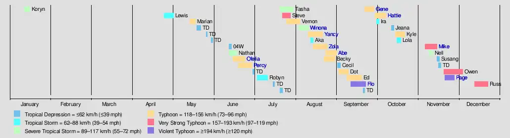 | Russ | December 13 – 23 | Very strong typhoon | 185 km/h (115 mph) | 915 hPa (27.02 inHg) | Marshall Islands, Mariana Islands, Caroline Islands | $120 million | None | |