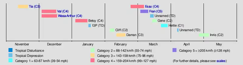 | Tia | November 12 – 21 | Category 3 severe tropical cyclone | 140 km/h (85 mph) | 960 hPa (28.35 inHg) | Kiribati, Solomon Islands, Vanuatu | Minimal | None | [4][10] |