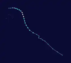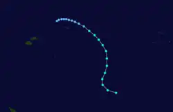 Early on December 8, the NWOC reported that Wasa had peaked with 1-minute sustained windspeeds of 195 km/h (120 mph), which made it equivalent to a category 3 hurricane on the SSHWS.[14] The next day, the FMS estimated peak 10-minute winds of 165 km/h (105 mph), making Wasa a Category 4 severe tropical cyclone.[5][14] Over the next few days, the system weakened into a tropical depression after passing through the Society and Austral Islands.[1][15] The NWOC issued their final advisory on Wasa on December 13, as the system turned northeastward to warmer waters.[13][14][15] Later that day, Wasa became sufficiently organized to be reclassified as a category 1 tropical cyclone by the FMS, who renamed it Arthur.[1] Over the next 24 hours, Arthur passed about 80 mi (130 km) north-northwest of Mururoa, which reported winds of 70 km/h (45 mph).[15] On December 14, the FMS reported that Wasa-Arthur had reached its secondary peak intensity of 130 km/h (80 mph).[1][15] The cyclone maintained this intensity while moving eastward through the uninhabited Acteon Group of islands and other atolls. On December 15, the NWOC classified it as Tropical Cyclone 08P, with peak 1-minute winds of 85 km/h (55 mph).[1][15][16][17] On December 16, the system gradually weakened into a shallow depression, and both the FMS and the NWOC issued their final advisories on Wasa-Arthur.[15]