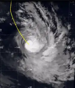During March 24, the FMS reported that a tropical depression had developed within the South Pacific Convergence Zone and a favourable environment for further development, to the north of the Tuamotu Islands in French Polynesia.[1][49] During that day, the system gradually developed further with its convective cloud signature improving, as it moved slowly south-eastwards under the influence of a northerly environmental steering flow.[1][49] During the following day, the NPMOC and the FMS reported that the depression had developed into a tropical cyclone, with the latter naming it as Hettie after gale-force wind speeds had wrapped around the system's centre.[1][16] After being named, Hettie gradually intensified further as it moved south-eastwards and passed in between Tahiti, Hereheretue and Nukutepipi during March 26.[49][50] During March 27, the FMS reported that the system had peaked with estimated 10-minute sustained windspeeds of 85 km/h (50 mph), while it was located about 150 km (95 mi) to the southwest of Hereheretue.[1] This was followed by the NPMOC later that day, who estimated that Hettie had peaked with 1-minute peak sustained windspeeds of 100 km/h (65 mph).[49][50]