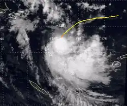 On February 11, the FMS started to monitor a shallow tropical depression that had developed within the monsoon trough to the south of Tokelau.[34] Over the next few days the system moved towards the west-southwest under the influence of an easterly steering flow, before the system started to accelerate and passed through the islands of Tuvalu during February 14.[34]