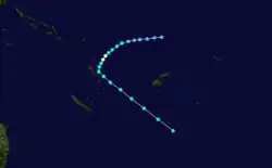 On February 24, a shallow tropical depression developed within the monsoon trough of low pressure, about 370 km (230 mi) to the northeast of Port Vila, Vanuatu.[35] Over the next day the system moved south-westwards and gradually developed further, before it passed over northern Vanuatu between February 25–27.[35][11] During February 26, the JTWC and the FMS reported that the depression had developed into a tropical cyclone, with the latter naming it as Easu, while it was located to the east of Espiritu Santo in Vanuatu.[13][35] Throughout that day as Esau intensified further, it moved south-westwards and away from the islands of Vanuatu.[35] Esau subsequently accelerated westwards to the north of an intense subtropical ridge of high pressure and gradually intensified further as it moved into an area of decreasing vertical windshear.[1] During February 28, the FMS subsequently reported that the system had peaked as a category 4 severe tropical cyclone with 10-minute sustained wind speeds of 185 km/h (115 mph).[1][36] The system subsequently moved into the Australian region and brought gale-force winds to the Solomon Islands during February 29.[1] The JTWC also reported that Esau had peaked with 1-minute sustained wind speeds of 240 km/h (150 mph), which made it equivalent to a category 4 hurricane.[36] Over the next few days the system moved south-eastwards and back into the South Pacific basin, under the influence of a northwest steering flow and threatened the southern islands of Vanuatu.[35] The system subsequently came to within 450 km (280 mi) of southern Vanuatu before turning southwards and threatening the French overseas territory of New Caledonia.[35] The system made landfall on the French territory of New Caledonia during March 4, as a category 3 severe tropical cyclone.[35] As a result of passing over the mountainous island nation and increasing vertical wind shear, the system transitioned into an extratropical cyclone over the cooler waters of the Tasman Sea.[35] The extratropical remnants of Cyclone Esau subsequently made landfall on New Zealand's North Island during March 8, before they were last noted during the next day over the South Pacific Ocean.[37]