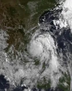 A tropical wave emerged off the coast of Africa on June 20, and no significant development occurred until it became Tropical Depression Two in the western Gulf of Mexico on July 5.[16][17] On its first advisory, a tropical storm watch was issued for from Baffin Bay, Texas, southward to Tampico, Tamaulipas.[18] Nearing the coast of Mexico, the depression attained its peak intensity with winds of 35 mph (56 km/h) and a minimum pressure of 1,007 mbar (29.7 inHg). Failing to intensify further, Tropical Depression Two made landfall near La Pesca, Tamaulipas, on July 6.[19] The National Hurricane Center issued the final advisory on July 7,[20] although the circulation persisted until July 9 southwest of Texas.[16] The depression had only minor impacts in Mexico and Texas, other than rainfall. Precipitation was heaviest in the state of San Luis Potosí, where the rainfall peaked at 17.47 in (444 mm) in Tamazunchale.[16]