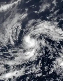 Upon becoming a tropical storm, only slow strengthening was forecast, due to the presence of an upper-level trough to its west.[51] The storm ultimately reached peak winds of 50 mph (80 km/h), which it maintained for about 36 hours. On September 10 it attained its organizational maximum after developing a central dense overcast. Later that day, an upper-level low increased wind shear over the storm,[49] which exposed the circulation from the deep convection.[52] As Danny approached the Lesser Antilles, it weakened to tropical depression status on September 11. Later that day, a Hurricane Hunters flight was unable to locate a closed circulation, which indicated that Danny degenerated into a tropical wave about 150 mi (240 km) east of the Lesser Antilles. The remnants tracked to the northwest and later to the north before being absorbed by a frontal system.[49]