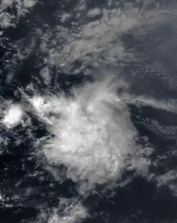A tropical wave moved off the coast of Africa on October 19. Moving westward, it developed a weak circulation on October 23.[70] Despite the presence of strong shear, the system was upgraded to a tropical depression at 2200 UTC on October 24 about 1,100 miles (1,800 km) east of the Lesser Antilles.[71] This was based on a rating of 1.5 on the Dvorak technique, which is a method of estimating the intensity of tropical cyclones via satellite.[70] At the time of development, the depression had a small area of convection near and east of the center, and due to the wind shear it was never expected to intensify.[71] By October 25, the circulation had become dissociated from the convection.[72] The depression dissipated soon after without affecting land.[73]