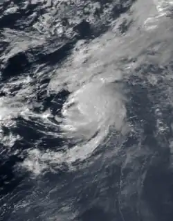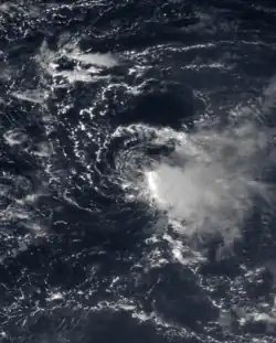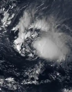 One of the few vigorous tropical waves of the season emerged from the western coast of Africa with a large area of convection in late August. On August 24 it developed into a tropical depression near Cape Verde.[10] Upon first forming, the depression had a circular area of convection near the center.[35] It was initially well-organized,[10] but the depression was not expected to intensify due to marginal water temperatures; tropical cyclones generally require warm waters to develop.[35] By August 25, the system lost much of its deep convection,[36] and on August 26 the depression dissipated to the west-southwest of the Cape Verde islands.[10]