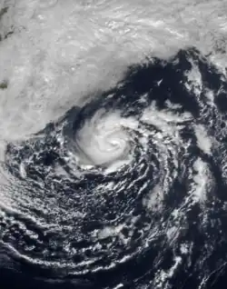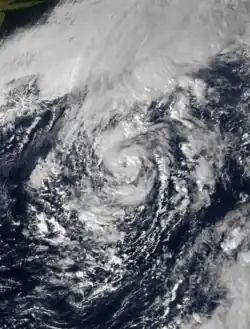 After peaking, Claudette began steady weakening.[46] Around that time, a hurricane watch was issued for the island of Bermuda, which was later upgraded to a warning.[47] The hurricane turned to the northwest, passing 136 miles (219 km) east of Bermuda as a Category 1 hurricane on September 8.[48] Winds on the island peaked at 23 mph (37 km/h), with gusts to 32 mph (51 km/h), and waves reached up to 8 ft (2.4 m) in height.[47] By September 10, Claudette weakened to tropical storm status as it accelerated eastward. The next day it deteriorated further to tropical depression status, and the next day Claudette became extratropical to the southwest of the Azores. It persisted two more days until dissipating over the Azores.[45]
