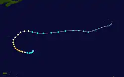 The season's activity was reflected with a low cumulative accumulated cyclone energy (ACE) rating of 36.[11] ACE is, broadly speaking, a measure of the power of the hurricane multiplied by the length of time it existed, so storms that last a long time, as well as particularly strong hurricanes, have high ACEs. ACE is only calculated for full advisories on tropical systems at or exceeding 34 knots (39 mph; 63 km/h) or tropical storm strength. Although officially, subtropical cyclones are excluded from the total,[12] the figure above includes periods when storms were in a subtropical phase.