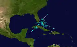 The origins of Fabian were from a tropical wave and a cold front that entered the northwestern Caribbean Sea on October 12, which produced an area of thunderstorms in the Gulf of Honduras.[59] At 1300 UTC on October 15, a Hurricane Hunters flight observed sustained winds of 40 mph (64 km/h) to the southwest of the Isle of Youth. Based on the report, the NHC designated the system as Tropical Storm Fabian.[59][60] although the NHC later assessed that the system developed as a tropical depression earlier that day.[61] With a high pressure area to the north, there was already a large pressure gradient that had produced tropical storm force winds over the area.[62] Initially the storm was disorganized,[59] with its strongest winds located primarily east of the center.[63] An eastward-moving upper-level trough imparted a northeast motion as well as unfavorable wind shear.[60] After reaching peak winds of 45 mph (72 km/h), Fabian crossed the Isle of Youth before crossing western Cuba.[59] By early on October 16, the center was becoming difficult to locate as Fabian moved through the Florida Straits.[64] The storm later moved through the Bahamas and became extratropical as it interacted with an approaching front.[59]