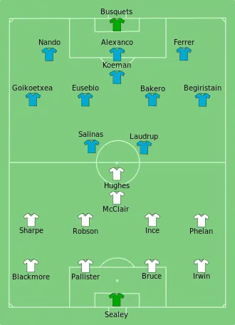 After Koeman scored from a free kick, which came off the upright and hit the legs of United keeper Les Sealey before crossing the line, Barcelona had a late equaliser ruled out for offside and also had a shot cleared off the line. United finished the game 2–1 winners.