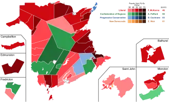 As expected, the Liberal Party won a large majority. Many were surprised that the Confederation of Regions Party formed the official opposition.[1] Though they ran even with the PCs in popular vote, their concentration of support in rural anglophone ridings gave them considerably more seats. Weir's personal popularity and name recognition was not enough to give her party more seats as she, and the Tories, had votes relatively evenly spread around the province.