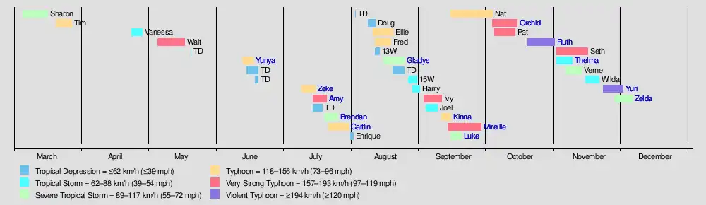 | Ruth (Trining) | October 19 – 31 | Violent typhoon | 215 km/h (130 mph) | 895 hPa (26.43 inHg) | Caroline Islands, Mariana Islands, Taiwan, Philippines | $151 million | 82 | |