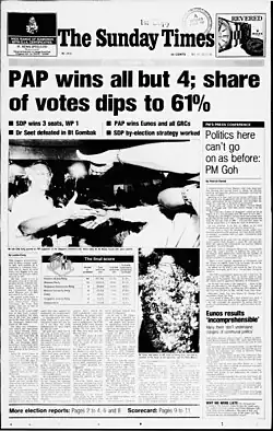 At a post-election press conference on the night of 31 August, Goh attributed the swing against the PAP to his "open and consultative style of government" and pledged to re-evaluate his style. Since the introduction of the Non-Constituency Member of Parliament scheme in 1984, this was the first election (and to date the only as of 2025) no NCMP seats were offered since four elected opposition seats exceeded the minimum of three NCMP seats allotted; this led to the eventual retirement of Lee Siew Choh in 1993, despite his team of Eunos GRC being narrowly defeated by an inferior margin.[1]