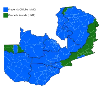 General elections were held in Zambia on 31 October 1991 to elect a President and National Assembly. They were the first multi-party elections since 1968, and only the second multi-party elections since independence in 1964. The United National Independence Party (UNIP), which had led the country since independence (from 1973 to 1990 as the sole legal party), was comprehensively beaten by the Movement for Multi-Party Democracy (MMD).[1] Kenneth Kaunda, who had been president since independence, was defeated in a landslide by MMD challenger Frederick Chiluba in the presidential elections, whilst the MMD won 125 of the 150 elected seats in the expanded National Assembly. Voter turnout was 45%.[2]