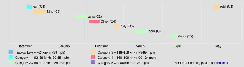 Polly 25 – 28 February Category 3 severe tropical cyclone 140 km/h (85 mph) 955 hPa (28.20 inHg) None None None