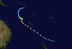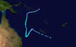 Developed in the Coral Sea far offshore from Queensland. The cyclone intensified to a Category 3 severe tropical cyclone before crossing out of Australian region on 1 March where it passed to the southwest of New Caledonia.[3]