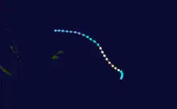 Developed in the Australian region of the Coral Sea far offshore from Queensland. The cyclone intensified to a Category 3 severe tropical cyclone (Australian intensity scale) before crossing into the South Pacific region where it passed to the southwest of New Caledonia.[17]