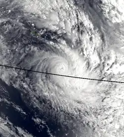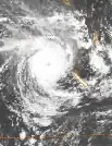 On December 23, TCWC Nadi started to monitor a tropical depression, that had developed within the monsoon trough about 340 km (210 mi) to the northeast of Honiara on the Solomon Island of Guadalcanal.[5] Over the next few days the depression gradually developed further as it moved slowly towards the south-southeast, before during December 26, the JTWC designated the system as Tropical Cyclone 07P and started to issue warnings on the system as it had become equivalent to a tropical storm.[6][7] During the next day, the system appeared to slightly relax before it resumed developing from about 1200 UTC with the FMS naming it as Kina later that day, after the depression developed into a category one tropical cyclone.[5][6] Early on December 28, the JTWC reported that the system had become equivalent to a category 1 hurricane on the SSHWS.[6] During that day Kina continued to develop as it moved south-eastwards, before it turned towards the south and became slow moving later that day, before the JTWC reported during the next day that Kina had reached its peak intensity with 1-minute sustained wind speeds of 220 km/h (140 mph) which made it a category 4 hurricane on the SSHWS.[6][7] Later that day TCWC Nadi reported that Kina had peaked as a category 3 severe tropical cyclone with 10 – minute sustained wind speeds of 150 km/h (90 mph).[5][6]
