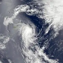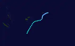 Tropical Cyclone 08P was first noted as a tropical depression by the FMS during January 1, while it was located about 500 km (310 mi) to the east of Alofi in Niue.[18] During that day the depression moved eastwards, before the NPMOC initiated advisories on the system and designated it as Tropical Cyclone 08P.[7][18] During that day 08P started to move towards the southeast through the Cook Islands, before it peaked with estimated 1-minute sustained wind speeds of 85 km/h (50 mph).[7] During January 3, 08P rapidly degenerated into an extratropical low, while it was located about 405 km to the southeast of Papeete in French Polynesia.[18] There were no reports of any impacts within the Cook Islands associated with 08P.[18] Tropical Cyclone 09P developed on January 11, while it was located about 610 km (380 mi) to the north of the island of Tahiti in French Polynesia.[7][19] Over the next couple of days the system moved westwards and gradually turned and started to move south-eastwards before it was last noted during January 14.[7][19]