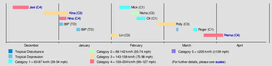 Nina January 1 – 5 Category 4 severe tropical cyclone 165 km/h (105 mph) 960 hPa (28.35 inHg) Queensland, Solomon Islands, Wallis and Futuna, Rotuma, Tonga $110 million 26 [10]