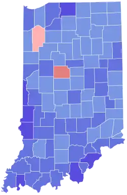 Bayh carried all but two counties (Clinton and Jasper). As of 2025, this would be the last occasion that the following counties have voted Democratic in a gubernatorial election: Boone, Daviess, Elkhart, Hamilton, Hendricks, Huntington, Johnson, Kosciusko, Lawrence, Miami, Morgan, Union, Wabash, and Wells.