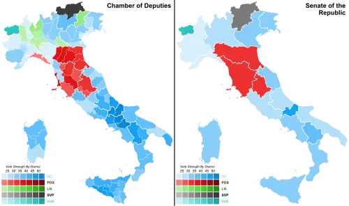 General elections were held in Italy on 5 and 6 April 1992.[1] They were the first without the traditionally second most important political force in Italian politics, the Italian Communist Party (PCI), which had been disbanded in 1991. Most of its members split between the more democratic socialist-oriented Democratic Party of the Left (PDS), while a minority who did not want to renounce the communist tradition became the Communist Refoundation Party (PRC); between them, they gained around 4% less than what the already declining PCI had obtained in the 1987 Italian general election, despite PRC absorbing the disbanded Proletarian Democracy (DP).