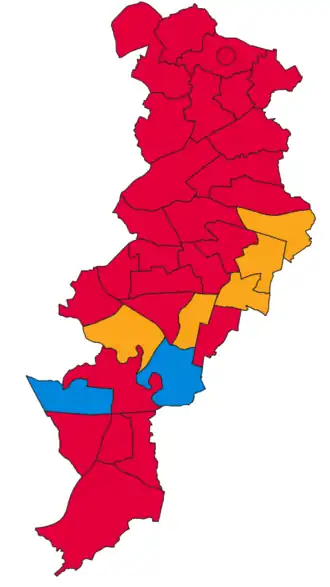| Labour Party | 43,405 (48.9%) | 27 (79.4%) | 27 / 34