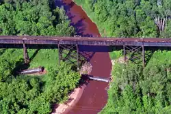 The derailment of the southbound freight train happened at about 2:50 am June 30, 1992, at the intersection of Wisconsin Highway 35, the railroad line and the Nemadji River.[2] The train's, three engines and several freight cars made it safely across the bridge and onto the other side before the derailment occurred. Three tank cars as well as a boxcar, a hopper and several bulkhead flatcars loaded with lumber, derailed on the curve that led straight towards the bridge. Due to the 'dragging effect' of the derailed freight cars in the middle portion of the train, resulted in tumbling off the rails in the middle section of the bridge and plunging 75 feet down into the river below. Directly behind the derailed cars of the mid-section of the train, several of the derailed cars on the curve leading upto the trestle, tipped over onto their sides, spilling lumber all over the place, while the remaining cars at the rear of the train remained on the tracks unharmed. When the derailment happened, the engine crew felt a jolt and brought the train to an emergency stop. After noticing that there was a derailment, they immediately radioed the BN dispatcher about the accident. One of the train's tank cars fell 75 feet from the bridge into the Nemadji River. The ruptured car released nearly 22,000 gallons of aromatic concentrates including liquid benzene and toluene into the river. Thirteen other derailed cars fell onto land banks. Two of these cars were carrying propane; other cars were carrying lumber.[1] The water at the location of the BN bridge over Nemadji River was seven feet deep. The US NOAA's initial statement that day estimated the water flow rate to be 830,000 gpm, and that accordingly, the water would soon flush away spilled oil product. However, in the NOAA's early statement, it said that the water in Superior Bay was stagnant with a high turbidity.[2]