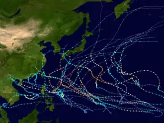 The 1992 Pacific typhoon season was the fifth consecutive above-average season, producing 31 tropical storms, 16 typhoons and five super typhoons. It had no official bounds; it ran year-round in 1992. Despite this, most tropical cyclones tend to form in the northwestern Pacific Ocean between June and November.[1] These dates conventionally delimit the period of each year when most tropical cyclones form in the northwestern Pacific Ocean.