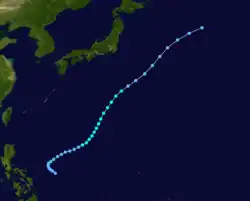 Early the next day, Bobbie intensified into a severe tropical storm.[9] At that time, the JTWC claimed that Bobbie had intensified into a typhoon,[9] while the JMA noted that Bobbie had actually became a typhoon several hours later.[5] On 18:00 UTC on 26 June, Bobbie peaked with 1-minute sustained winds of 140 mph (220 km/h) as it tracked the western extent of the mid-level subtropical ridge.[9] Several hours later, Bobbie peaked with 10-minute sustained winds of 105 mph (165 km/h).[5] As Bobbie began recurving east of Taiwan at 12:00 UTC that day, increasing southwesterly winds caused Bobbie to steadily weaken. Passing over Miyako Jima on 28 June and then just southeast of Okinawa on 29 June, Bobbie began undergoing an extratropical transition on at that time.[9] At that time, Bobbie weakened into a severe tropical storm as it left the PAR, causing PAGASA to stop issuing advisories on the storm.[9] As Bobbie transitioned into an extratropical storm, the JTWC issued their final warning on the system the next day, prior to it brushing the southern tip of Honshu.[9] The JMA noted that Bobbie became extratropical early the next day, prior to it dissipating on 3 July.[5]