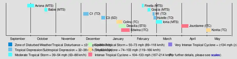 During the season, the Météo-France office (MFR) on Réunion island issued warnings in tropical cyclones within the basin. The agency estimated intensity through the Dvorak technique,[4] and warned on tropical cyclones in the region from the coast of Africa to 90° E, south of the equator.[5] The Joint Typhoon Warning Center (JTWC), which is a joint United States Navy – United States Air Force task force, also issued tropical cyclone warnings for the southwestern Indian Ocean.[6] The storms in the season lasted about five days on average, although Cyclone Edwina lasted the longest at 11 days. Storms formed throughout the basin and were fairly evenly distributed throughout the season, with the exception of a lull in November. Most storms originated from the Intertropical Convergence Zone (ITCZ). MFR named storms throughout the season using 11 names from a sequential list.[4] The remainder of the list was Laura, Monette, Neige, Octavie, Pamela, Rosita, Stella, Tasiana, Vigonia, Wendy, and Yolande.[7]