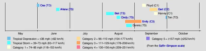 Tropical cyclogenesis in the 1993 Atlantic hurricane season began with the development of Tropical Depression One on May 31.[7] However, in the following two months, minimal activity occurred, with only one named storm, Arlene, in June. August was the most active month, with four systems developing: Tropical Storms Bret, Cindy, and Dennis, as well as Hurricane Emily.[8] September, normally the climatological peak of hurricane season,[11] had only three named storms form: Hurricanes Floyd, Gert, and Harvey.[8] The final Atlantic tropical cyclone of 1993, Tropical Depression Ten, became extratropical on September 30, two months before the official end of the season on November 30.[7][10]