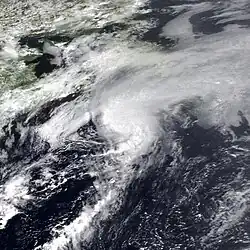The storm accelerated north-northwestward after becoming embedded within fast air currents, which was as Floyd moved between a strong trough and a subtropical high pressure area. Later on September 8, the storm passed about 230 mi (370 km) west of Bermuda.[48] By early on September 9, convection developed along the once exposed low-level circulation. After a buoy reported a two-minute sustained wind speed of 69 mph (111 km/h) and an eye appeared on satellite imagery, Floyd was upgraded to a hurricane at 18:00 UTC on September 9. While accelerating at nearly 52 mph (84 km/h), the storm began losing tropical characteristics as a result of colder sea surface temperatures and became extratropical at 18:00 UTC on September 10. The remnants of Floyd continued rapidly eastward and struck Brittany, France, at an intensity equivalent to a Category 1 hurricane.[49] While passing southeast of Newfoundland, the storm produced light rainfall, peaking at about 0.86 in (22 mm).[50]