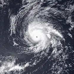 On August 30, a tropical disturbance developed south of Panama. Around 12:00 UTC on September 5, the system organized into a tropical depression as thunderstorms coalesced into loosely defined rainbands. These bands increased in intensity over subsequent hours, signaling the cyclone's intensification into Tropical Storm Kenneth by 06:00 UTC on September 6. Over the coming days, the cyclone moved on a sinussoidal-like path across the East Pacific, alternating between west and west-northwest. On September 8, Kenneth attained hurricane strength, which was followed by its development into a major hurricane on September 10, shortly after an eye first appeared on satellite. Early the following day, it became a powerful Category 4 cyclone with peak winds of 150 mph (240 km/h).[39] Kenneth displayed a small but well-defined eye embedded within a very cold central dense overcast at this time.[40] Soon, the cyclone encountered cooler waters and southwesterly wind shear on its northwest trek,[41] which caused the system to decay. Kenneth dissipated at 00:00 UTC on September 18, though its remnant circulation persisted for a few more days.[39]