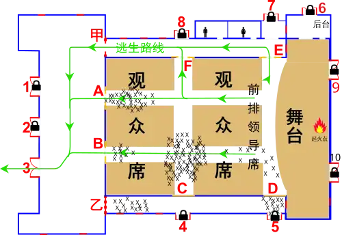 The Guangxi Fire Department has argued that the evacuation issues were caused by panic, with people trying to escape through the doors from which they entered instead of the less crowded doors E and F. Additionally, the anti-robbery bars installed significantly hampered evacuation through windows and other doors.[6]