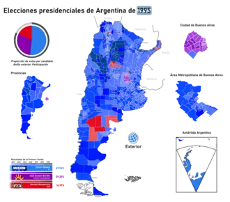 The Argentine general election of 1995 was held on 14 May. Voters chose both the President and their legislators and with a turnout of 82.1%. It became the first election in post-1983 Argentina to use the direct vote system, as the electoral college was abolished by 1995.