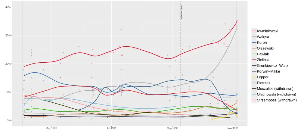 Presidential elections were held in Poland on 5 November 1995, with a second round on 19 November.[1] The leader of Social Democracy, Aleksander Kwaśniewski, and incumbent President Lech Wałęsa advanced to the second round. Kwaśniewski won the election with 52% of the vote in the run-off against 48% for Wałęsa.