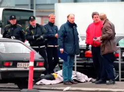 ![]() Police at the scene of the shooting. The body of Uffe Larsen lies beneath a white sheet. | |