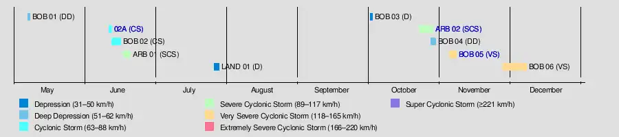 The IMD tracked nine tropical disturbances, including one that developed over land, which is below average of 13 systems. Five of the storms formed from October to December, after the end of the monsoon season. In general, storms moved slower than average, and two of the cyclones took unusual tracks near land – one executed a rare loop in the Bay of Bengal, and another turned abruptly away from the Indian state of Gujarat.[1] According to the JTWC, activity in the basin was 60% greater than average, with eight tropical cyclones. Four of these storms attained hurricane intensity – winds of at least 120 km/h (75 mph) – which was a record at the time.[3]