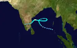 Originating from the monsoon trough, a well-defined circulation persisted on November 26 near the Andaman and Nicobar Islands, accompanied by a poorly defined area of convection.[3] It formed in an area of moderate wind shear,[40] allowing the system to slowly organize while moving to the west-northwest.[3] Both the IMD and the JTWC initiated warnings on November 28, the latter classifying it as Tropical Cyclone 08B.[1][3] On November 29, the storm turned to the north and east, beginning a four-day loop in the central Bay of Bengal; the JTWC noted that it was the longest-lasting loop on record in the body of water.[3] During this time, the system remained weak, never intensifying beyond deep depression status.[1] A strengthening ridge to the north turned the storm back to the west on November 30 into an area of lighter wind shear.[6] On December 2, the system intensified into a cyclonic storm and eventually to a very severe cyclonic storm on the next day, with the IMD estimating peak 3-minute winds of 120 km/h (75 mph).[1] The JTWC upgraded the system to the equivalent of a hurricane on December 4, estimating peak 1-minute winds of 140 km/h (85 mph).[3] Increased wind shear decoupled the convection from the center; the thunderstorms continued to the west-northwest and struck Andhra Pradesh, while the circulation turned southwestward. Weakening further, the system made landfall on Tamil Nadu between Chennai and Pondicherry around 16:00 UTC on December 6. It rapidly weakened over land, dissipating the next day.[1][3]