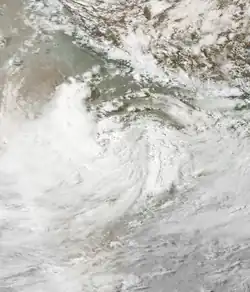 While the previous storm was paralleling the east Indian coastline, another disturbance formed off the west coast on June 15, also associated with the monsoon. The new area of convection persisted,[3] developing a distinct circulation by the next day. Early on June 17, a depression developed about 365 km (227 mi) west of Mumbai.[1] At 18:00 UTC that day, the JTWC classified it as Tropical Cyclone 04A, after the wind field became more defined.[3] The system moved to the northeast within the influence of the monsoon, and quickly intensified due to an anticyclone aloft providing favorable conditions.[1][18] On June 18, the IMD upgraded the system to a cyclonic storm, and further to a severe cyclonic storm by 18:00 UTC that day. At 23:00 UTC, the storm made landfall on Gujarat near Diu, only the fourth cyclone since 1891 to strike the state in June. An hour later the IMD assessed peak 3-minute winds of 110 km/h (70 mph), based on the appearance of an eye feature.[1] Meanwhile, the JTWC assessed slightly stronger 1-minute winds of 120 km/h (75 mph), equivalent to a minimal hurricane.[3] The storm turned northward and slowly weakened, degenerating into a remnant low over Rajasthan on June 20 before being swept up by an approaching trough.[1]