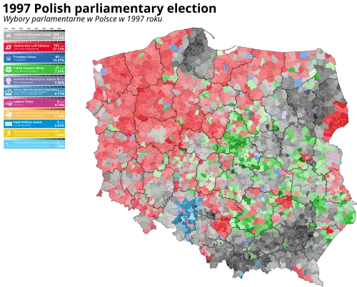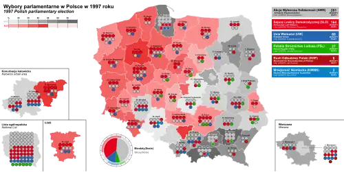 Parliamentary elections were held in Poland on 21 September 1997. All 460 members of the Sejm and 100 senators of the Senate were elected. The liberal conservative party Solidarity Electoral Action won the most seats in both chambers of parliament and formed a coalition government with the Freedom Union, another liberal party. The elections were a major setback for the Democratic Left Alliance and the Polish People's Party, which were forced out of government.