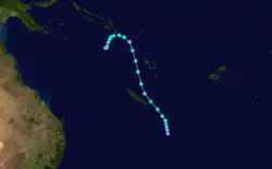 Over the next 3 days, Hali moved towards the west as it gradually intensified further, before early on March 16, an approaching upper trough of low pressure caused a weakness in the subtropical ridge.[1][10] As a result, the cyclone started to move towards the south, while the FMS reported that Hali had reached its 10-minute peak windspeeds of 120 km/h (75 mph), which made it a category 3 severe tropical cyclone on the Australian scale.[7][10] Later that day the FMS reported that the cyclone had started to rapidly weaken because of increasing vertical windshear and cooler sea surface temperatures, and interference from Tropical Depression 20F.[1][8] As a result, the FMS reported at 1200 UTC on January 18, that Hali had weakened into a depression before later that day the cyclone got caught up in the low level steering field and drifted into TCWC Wellington's area of responsibility during the next day.[11] The remnants of Hali were then last noted during March 20, as they dissipated about 1,200 km (745 mi) to the southeast of Avarua on the Southern Cook Island: Rarotonga.[7][2]