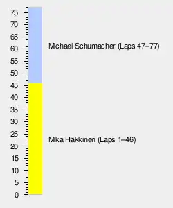 The 77-lap race was won by German driver Michael Schumacher, driving a Ferrari, after he started from third position. Drivers' Championship leader, Finn Mika Häkkinen, took pole position in his McLaren-Mercedes and led the first 46 laps. Under guidance from Ferrari technical director Ross Brawn, Schumacher opted to take three pit stops rather than the two favoured by the McLarens, and took the lead after his second stop, before extending his advantage such that he could retain it after his third stop.[2] Schumacher went on to win by 9.4 seconds from Briton David Coulthard in the other McLaren-Mercedes, with Canadian Jacques Villeneuve third in a Williams-Mecachrome.