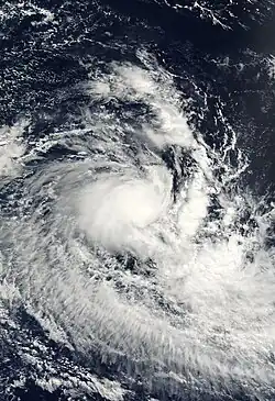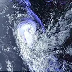 Late on February 22, the JTWC upgraded the storm to the equivalent of a minimal hurricane, while the MFR estimated peak 10‑minute winds of 110 km/h (68 mph).[38] This was based on a 100 km (62 mi) wide eye feature that had developed in the storm's center. Around the time of peak intensity, Felicia passed about 500 km (310 mi) southeast of Rodrigues. The interaction of the trough and a ridge to the east increased wind shear, causing the storm to weaken. On February 24, the storm became extratropical while still maintaining a well-defined circulation. It slowed and looped back to the northwest due to a ridge to the south, gradually becoming less defined and dissipating on February 26.[3]